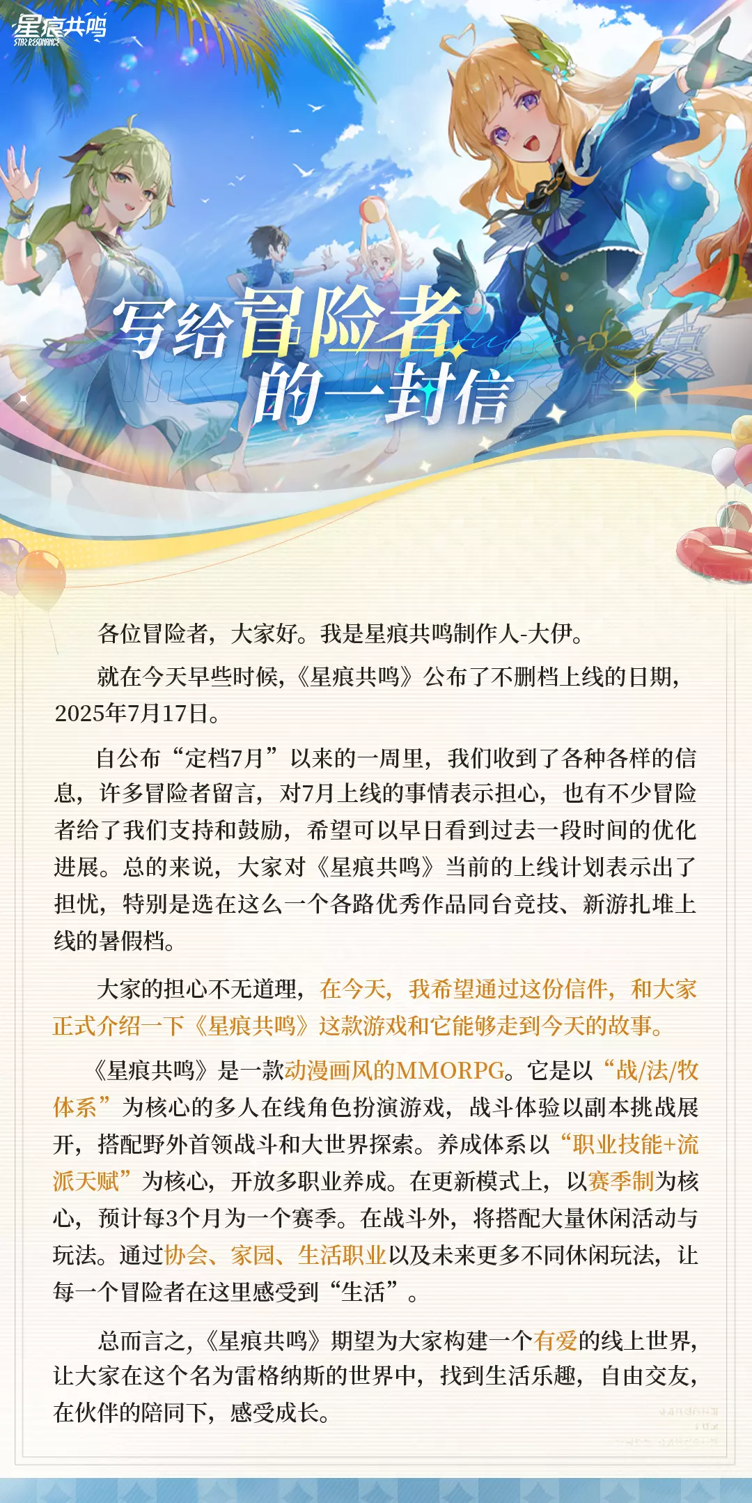 冒险者!《星痕共鸣》将于7月17日 不删档上线,目前已经进入最后的冲刺阶段。非常感谢过去一段时间,冒险者的支持和鼓励。