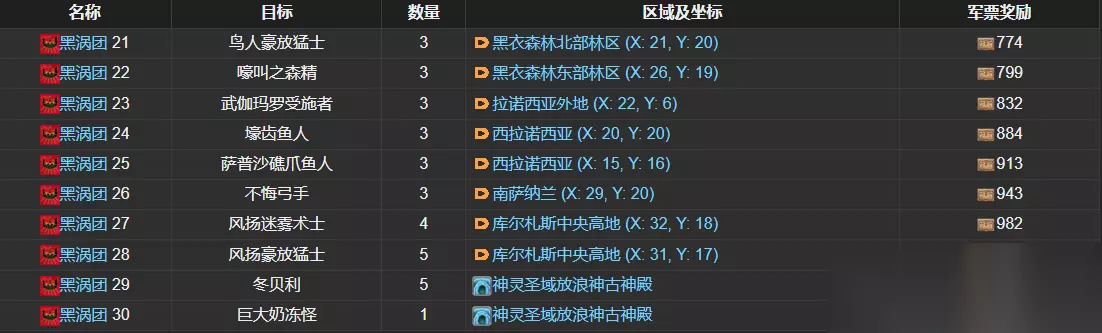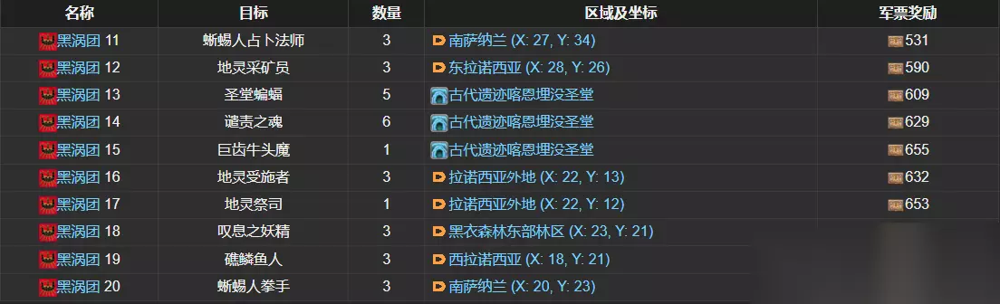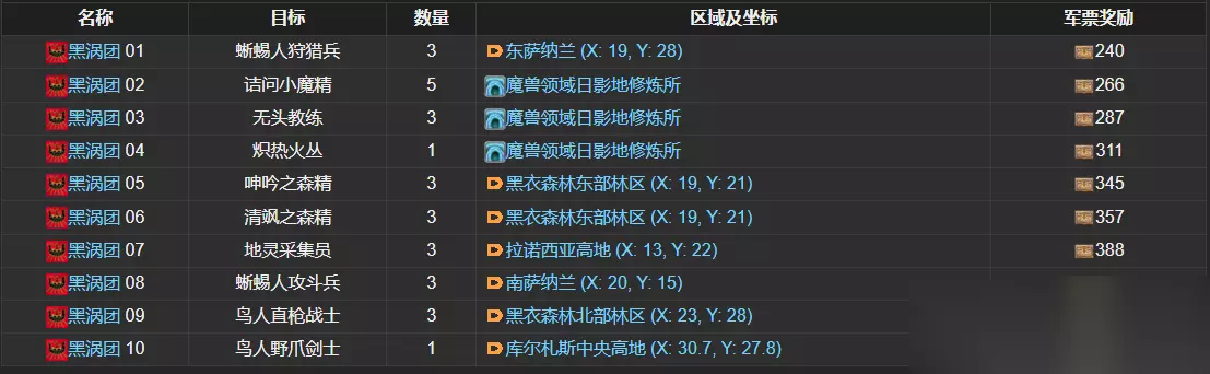 开放条件:黑涡团等级达到二等漩兵以上 完成后军票奖励:1181 蜥蜴人狩猎兵,东萨纳兰(X: 19, Y: 28);诘问小魔精,魔兽领域日影地修炼所;无头医师,魔兽领域日影地修炼所;炽热火丛,魔兽领域日影地修炼所。