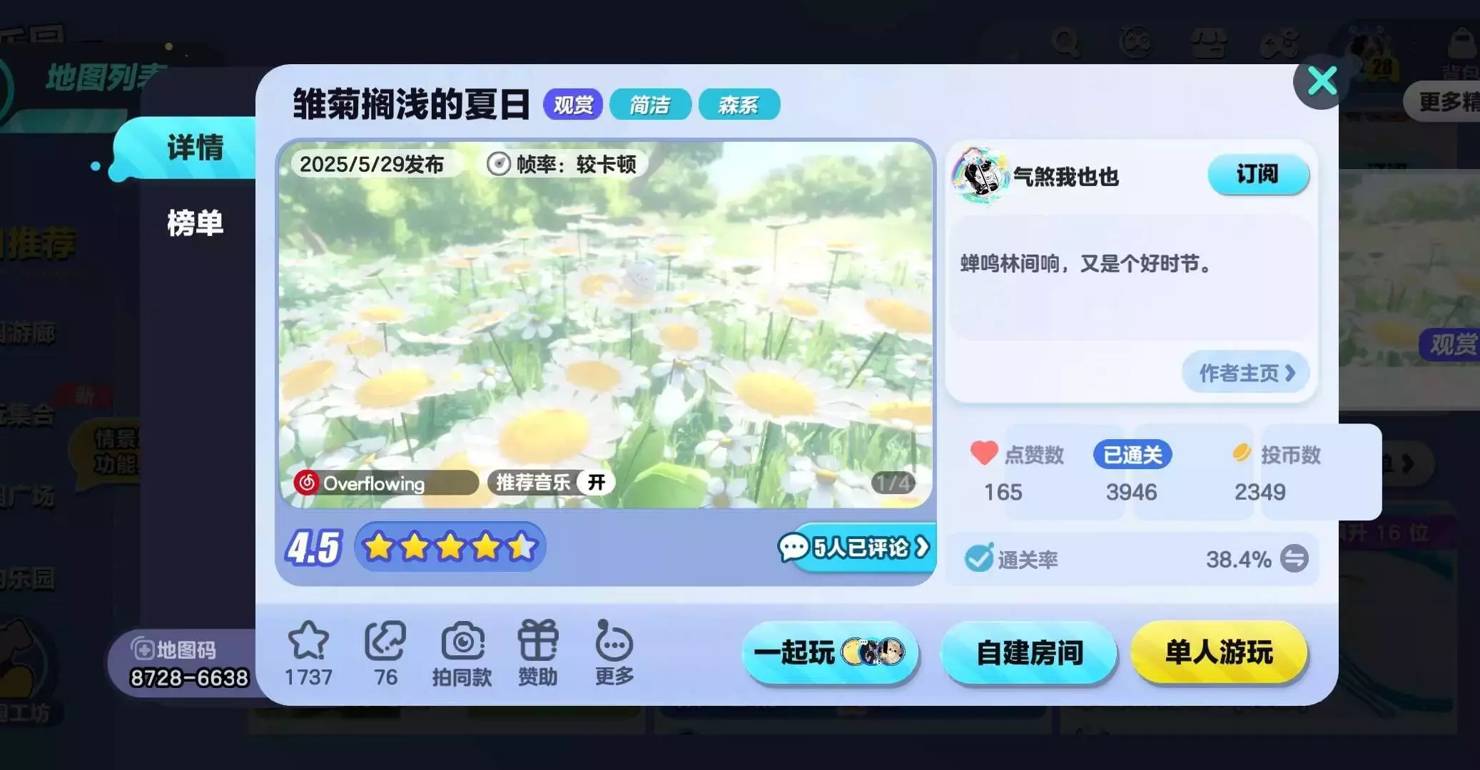 帧率:较卡顿💗这个地图有许多人游玩,也非常的适合和大家一起拍照或许也可以用来当做卡点视频的素材,快带上蛋搭子一起来拍照打卡❗️