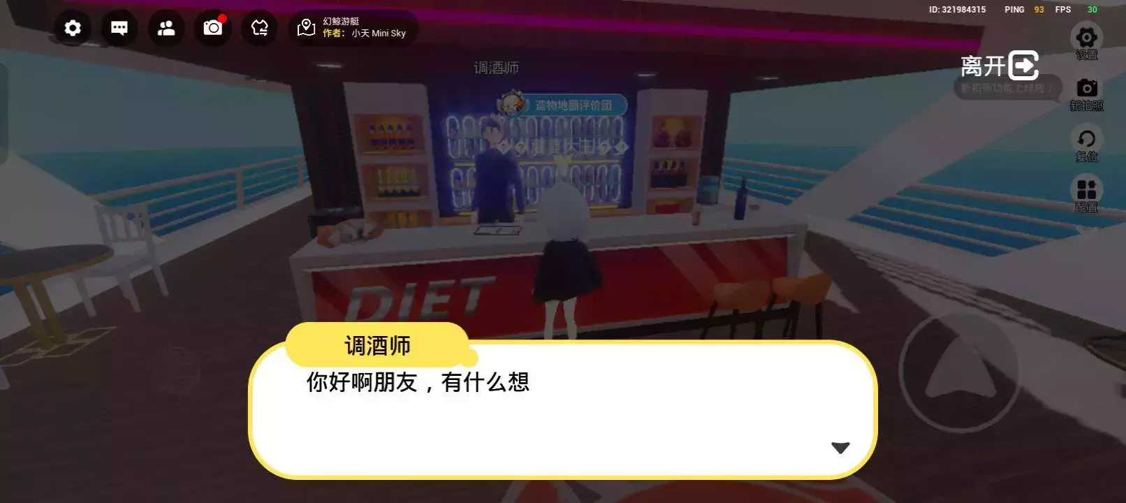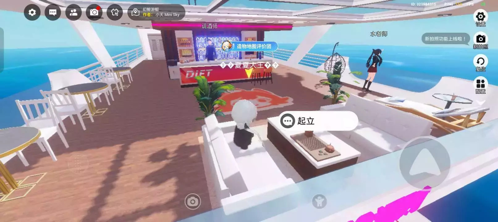 在幻鲸游艇地图中,玩家可以在不同区域自由探索。能坐在露天桌椅处欣赏海景,感受惬意时光;也可到吧台与调酒师互动,体验趣味对话。还可以在甲板泳池周边游玩,增添了不少乐趣。
