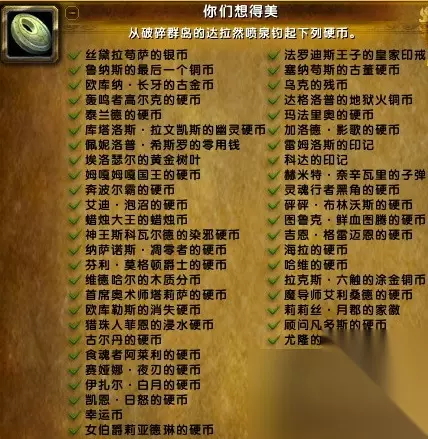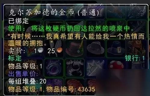 除了考古,钓鱼也是看脸大头。在达拉然的喷泉中,玩家可以用钓鱼技能钓出NPC们的许愿金币,其中不乏有许多人的心里话。像是“克总”克尔苏加德的许愿金币上就写着,“有时候……我真希望有人能给我一个热情而温暖的拥抱”,而结果大家都知道,克总变成了一个冷酷而寒冷的巫妖。