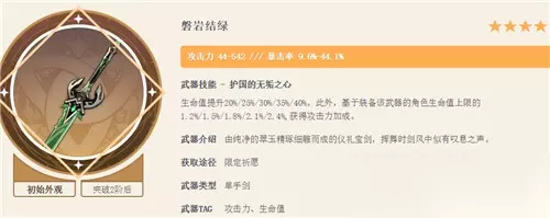 主C/副C万叶伤害上限最高的一把武器,副词条加高额暴击伤害,叠满三层武器特效后,能吃到28%的风元素伤害加成。 NO.3:磐岩结绿