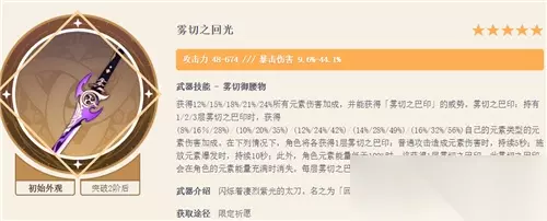 五星专武,副词条提供元素精通,提高万叶的增伤能力,武器特效提高全伤害,触发元素反应后还能提高主C的普攻伤害,是辅助万叶最好用的增伤武器。 NO.2:雾切之回光