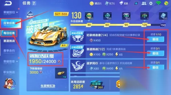 2、选择日常任务下方的每日任务,完成右侧任务,你将获得普通活跃度,这个活跃度可以转换为驾照活跃度。