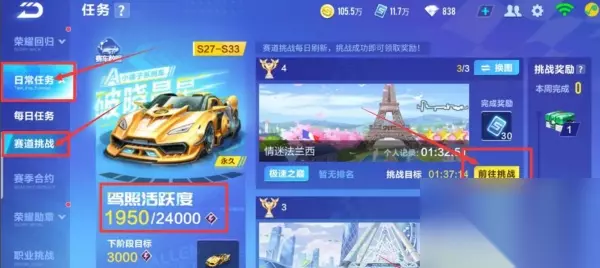 3、另外,你也可以选择日常任务下方的赛道挑战,完成这些任务后,领取驾照活跃宝箱,这将帮助你获得更多的驾照活跃度。