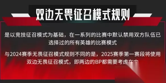 三、与传统征召模式的区别 1、传统征召模式 在常规的征召模式中,英雄的选择和禁用仅限于当前小局,同一英雄可以在系列赛的不同小局中被重复选用。 2、双边无畏征召模式 在整个系列赛中,已选用的英雄将被永久禁用,双方队伍都需要在每场比赛中重新调整策略和英雄选择。