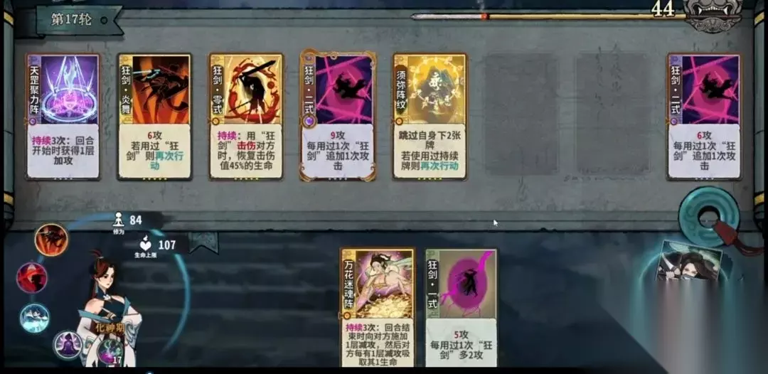 云狂剑: 优点:成型简单,伤害成长快,下限低。 缺点:容易被针对,不好针对其他人,过度难。 副职业选择: 阵法师:阵法师能够帮助狂剑过滤掉多余的牌使其更快成长更快爆发 天赋选择: 筑基期:休养生息>顿悟≥狂龙吞云>炽火炎刃 休养生息:能够提高容错且十分契合炎雪天赋。 顿悟:提高修为早日寻得T牌。 变化之道:保证血量健康,换到合适后可以留至其他修为阶段 炽火炎刃:虽然超模但不适合阵法师,能用。 金丹期:流冰寒刃>狂龙吞云>休养生息>顿悟 流冰寒刃:能使得狂剑体系容错更高。 元婴期:狂之执念>狂龙吞云>休养生息>顿悟 狂之执念:视作使用一次狂剑,极大提高狂剑上限,有了跟主流竞速的资本。 斩道:狂剑牌在元婴能够有效提高获得核心牌的效率,且能够根据来牌构筑少掉点血量。 化神期:炎舞>狂之执念>狂龙吞云>其他 炎舞:能视为一个视为狂剑的空格且狂剑再动稀少显得尤为强力。 过度思路: 可以当十里坡剑神(前期一直停留在筑基期D牌),也可以随着修为升阶,但一定12回合上化神。 云剑: 剑意: 混搭灵剑: 哪种体系来得多就玩什么,当然也可以一半一半混搭,都玩狂剑了就放松放松别想那么多。把爆发牌攻击力高的牌或者组合放前面即可。 关于玄心命坊: 有用但不完全有用,对狂剑来说有时候是副作用,因为狂剑发力期在后期,如果有那种前期商品就很亏,没有合适的不去理会就好, ps:可以根据大家的血量变化来推测有没有拿商品。大家的商品都是一样的(卡片阶级)(同职业卡片一样)。 其他细节: 第一轮牌注意,伤害总量最好达到18-20点(两轮牌库解决掉对手或多一张)之后随着血量增加伤害总量即可(不够可以D) 换牌次数,每回合自动+3次,10-12回合+4次,意味着达到化神之前能够有14换牌的机会(27+12=39)(顿悟自行减少),其次换牌次数的使用得根据实际情况来定,只要血量掉得少都是值得的。 关于博弈: 由于是阵法师一般来说是没有什么针对牌的,只能用减攻欺负欺负高频率的卡组,但胡起来狂剑都是克制这些高频卡组的。博弈的点也只剩下换核心牌的位置防止被断以及算算总伤害了。 这套卡只适合于过度前中期(3000分左右),真的很容易被针对。期待补强。