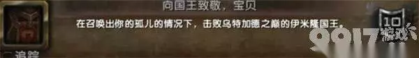 5、向国王致敬,宝贝 完成方法: 步骤:前往乌特加德之巅,在尾王前召唤出孤儿。击杀BOSS“尾王伊米隆国王”后,成就完成。