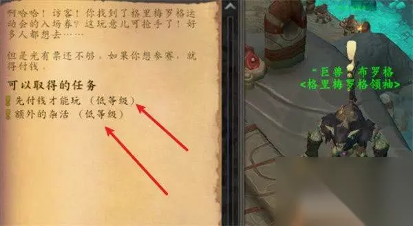 2、接受任务 与巨兽布罗格对话后,接取任务 “先付钱才能玩” 和 “额外的杂活”。这两个任务是刷取峈姆鼹鼠人名望的关键。