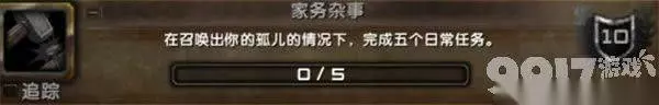 2、家务杂事 完成方法: 步骤:召唤孤儿,并带着他完成五个日常任务。任务类型包括钓鱼、专业副本日常任务、烹饪日常等。