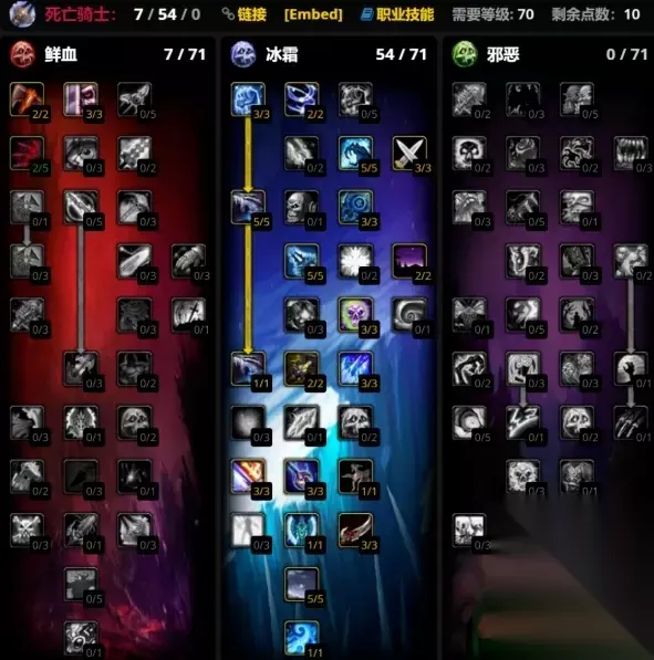 血DK的雕文大雕文用疾病雕文和吸血鬼雕文,小雕文则用活力分流、传染和亡者复生。 邪DK天赋推荐 邪DK在前夕版本中无法同时点出召唤石像鬼和冰冷之爪,这意味在70级无法使用双持邪的方式来进行输出,而只能使用双手武器。 邪DK的天赋加点没有什么太多的变化,主要是在邪恶系天赋中需要投入足够的点数,其中有一些也是可以变动的。给大家一个推荐加点的方式如下(侧重于单体输出):