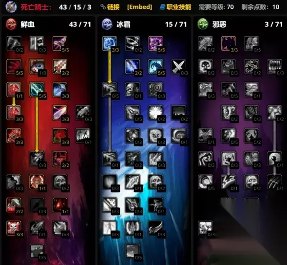 第二套是43/8/10,与第一套天赋的区别在于强化了邪恶系的疾病持续时间,同时点出凋零减冷却时间15秒,这在5H相当关键,而且多出了两点躲闪天赋。