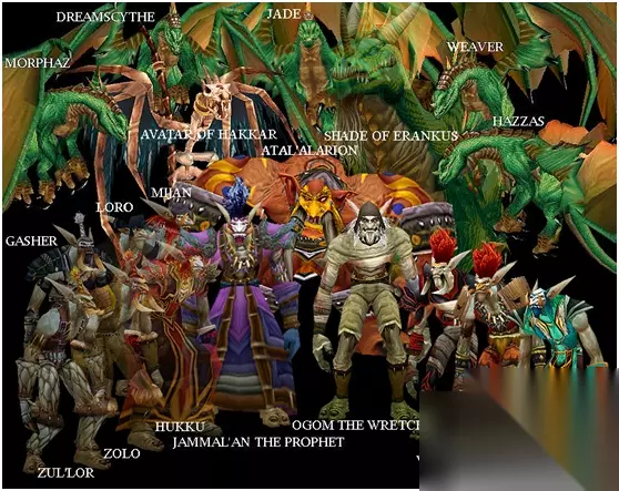 老神庙全BOSS-中央紫色长袍的正是为了复活哈卡的邪教徒-预言者加玛兰. 在哈卡的追随者与古拉巴什部族间发生的恐怖战争只在呢喃细语中流传。刚刚开始振兴的帝国被愤怒的邪神和他叛乱的子民所释放的魔法粉碎。正当这场战斗即将以哈卡获胜而结束的时候,巨魔们摧毁了哈卡的化身,将其从物质世界流放。甚至连那些阿塔莱祭祀都都被赶离首都祖尔格拉布,被迫在一处连地图上都未标明的北方沼泽地区中苟且偷生。在这些阴暗的沼泽中,他们为哈卡神建造了一座大神庙——阿塔哈卡神庙,并继续在那里为他们的主人工作着……