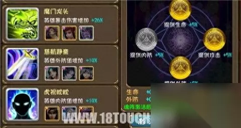 当然,我们在魂阵的选择上也不要盲目,而是有条件的。魂阵的挑选有2个条件,一是激活的总加成,如总角之好加成了英雄攻击力的10%,以及2个英雄战位的属性(内防5%和外防5%),而英雄构成是少年寇仲和少年徐子陵。 这个容易凑的魂阵我们就可以前期拿来使用。毕竟攻击力和双防都是我们前中期非常需要的。而到了中期我们在根据我们的阵容情况去激活顶级魂阵。