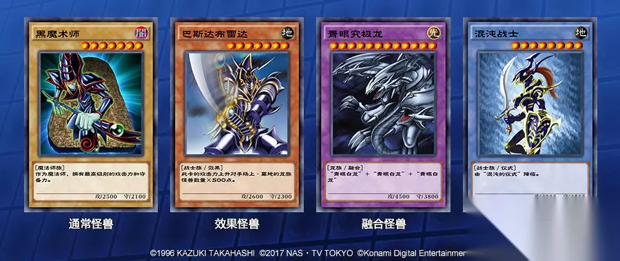 三、怪兽类型 通常怪兽 没有任何特殊效果的怪兽。 效果怪兽 拥有能在决斗中发挥各种能力的特殊效果的怪兽。 融合怪兽 与其他3种怪兽卡不同,融合怪兽需要事先放入额外卡组中,并且通过融合召唤的手段从额外卡组把融合怪兽召唤出场。 仪式怪兽 需要使用相应的仪式魔法进行仪式召唤才能出场的怪兽。