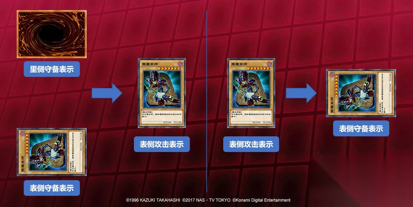 反转召唤: 反转召唤是指玩家主动将自己场上里侧守备表示的怪兽变为表侧攻击表示的动作。反转召唤在1回合中没有次数限制,但不能对当回合盖放的怪兽进行反转召唤。 怪兽在场上的摆放方式称为表示形式,并分为表侧攻击表示、里侧守备表示和表侧守备表示3种。玩家可以在自己回合对场上的每1只怪兽各改变1次表示形式,但在当回合被召唤或特殊召唤出场的怪兽不能改变表示形式。 在改变表示形式时需注意的是,里侧守备表示和表侧守备表示的怪兽都可以改变为表侧攻击表示,但表侧攻击表示的怪兽只能变为表侧守备表示。