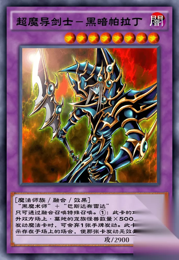 在众多求知若渴的目光聚焦之下,小编深感责任重大,决心通过这篇详尽的介绍,帮助大家全面了解并掌握《游戏王决斗链接》超魔导剑士的精髓所在。 游戏王决斗链接超魔导剑士介绍 一、卡牌介绍 名称:超魔导剑士一黑暗帕拉丁 获取途径:究极龙的崛起卡包 品质:超凡 效果:只可通过融合召唤特殊召唤。 ①:此卡的攻击力上升双方场上·墓地的龙族怪兽数量X500点。 ②:发动魔法卡时,可舍弃1张手牌发动。此卡以表侧表示存在于场上的场合,使那张卡发动无效并破坏。 攻击力/守备力:2900/2400 召唤方法:融合召唤 怪兽类型:融合怪兽