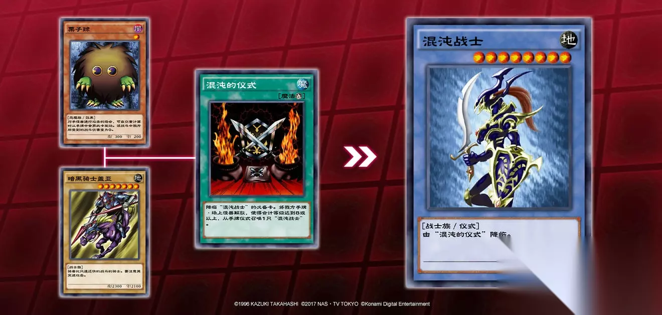 仪式召唤: 仪式召唤是指使用仪式怪兽所对应的仪式魔法卡,按照仪式魔法卡所记述的要求,将自己手牌及场上的怪兽解放,从手牌将仪式怪兽特殊召唤出场。要注意的是,仪式怪兽与融合怪兽不同,需要事先加入到主卡组而非额外卡组中。 以仪式怪兽“混沌战士”为例,它需要通过仪式魔法“混沌的仪式”的效果,把等级合计为8以上的怪兽解放来特殊召唤。例如,当自己手牌和场上集齐等级7的“暗黑骑士盖亚”和等级1的“栗子球”时,发动“混沌的仪式”并将满足等级要求的怪兽解放即可从手牌将一只“混沌战士”仪式召唤到场上。
