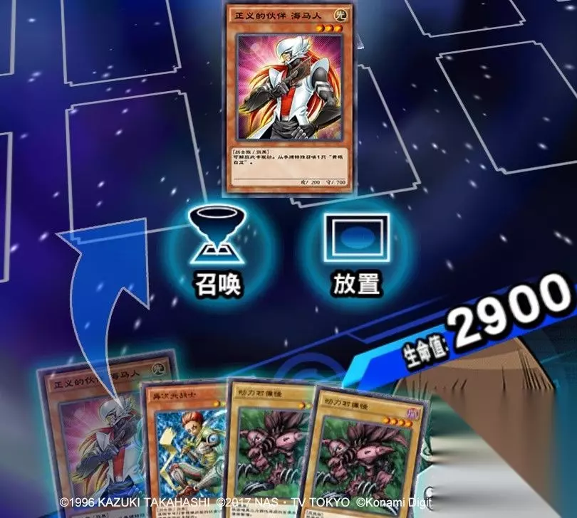 二、召唤介绍 通常召唤: 通常召唤包括召唤(上级召唤)、放置两种方式,且1回合中只能选择其中1种方式进行1次。 召唤(上级召唤): 召唤是指从手牌把怪兽以“表侧攻击表示”打出到怪兽区的方式,是《游戏王:决斗链接》中最普通的召唤方式。其中,等级4及以下的怪兽可以直接召唤到场上,等级5和等级6的怪兽需要将自己场上的1只怪兽解放(即送去墓地)来召唤到场上,而等级7以上的怪兽则需要解放2只怪兽才能召唤。这种通过解放自己场上的怪兽来召唤等级5及以上怪兽的方式称为“上级召唤”。 例如,当自己场上已经存在2只怪兽时,将那2只怪兽送去墓地(即解放),即可从手牌将1只等级8的“青眼白龙”上级召唤到自己场上。 放置: 放置是指从手牌将一只怪兽以“里侧守备表示”盖放在怪兽区的方式。在放置等级5以上怪兽的时候,和召唤一样,也需要将自己场上的怪兽解放来进行。