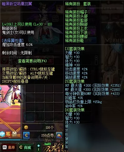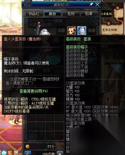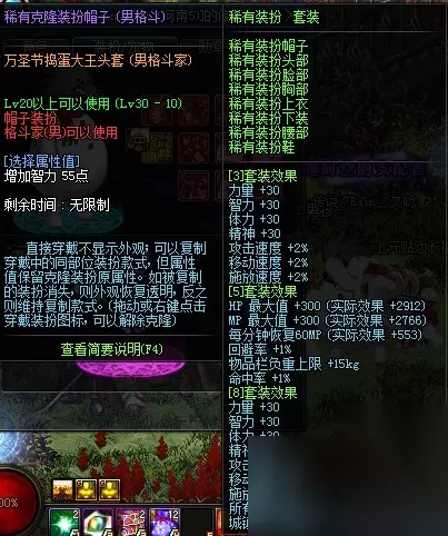 第三种:节日装扮。附加属性比高级时装高,个别部位还有额外的属性,节日活动期间商城出售,全穿8件或9件节日时装才有套装效果。