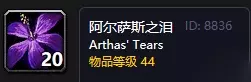 魔兽世界怀旧服阿尔萨斯之泪作用介绍 作用:阿尔萨斯之泪是非常重要的材料,我们可以把它用来做侦测亡灵药剂、阿尔萨斯的礼物、进行紫色染料,深红染料的研磨。而且阿尔萨斯之泪可以用来完成任务,比如收集材料、联盟需要更多阿尔萨斯之泪等。