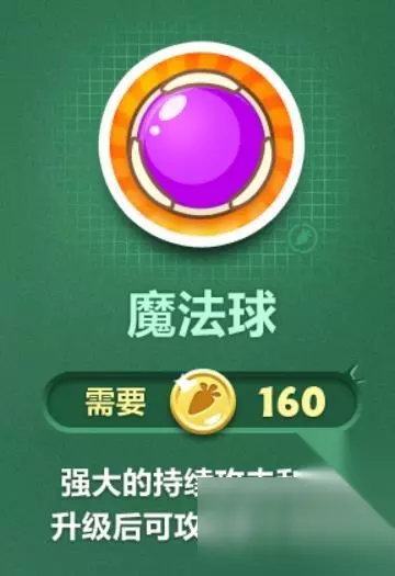 3、魔法球:满级最多可以同时对三个怪物进行持续性激光式攻击,无法清道具的同时对怪物进行攻击,清道具只能对一个道具进行攻击。在BOSS战中高频率的输出可以获得更多的萝卜币,攻击力较低。