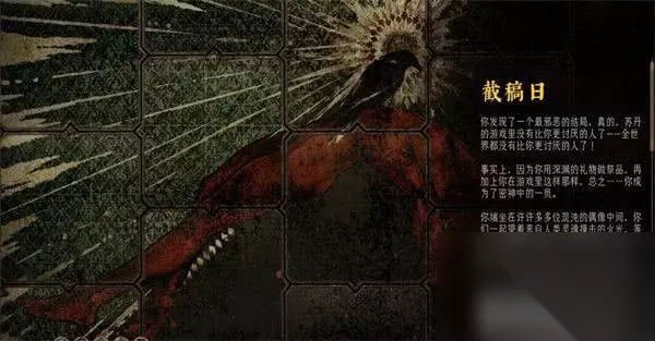 三、仪式关键点:锁定慈爱成就 在完成四阶段献祭任务后,进入神诞仪式。这一步是成就能否解锁的最终关键操作: 操作指令: 将深渊的礼物放入神诞仪式的空白卡槽中。 此举意味着你正式放弃弑神权利,成为邪神的容器。成功后,游戏会直接进入结局,并触发【慈爱】成就。