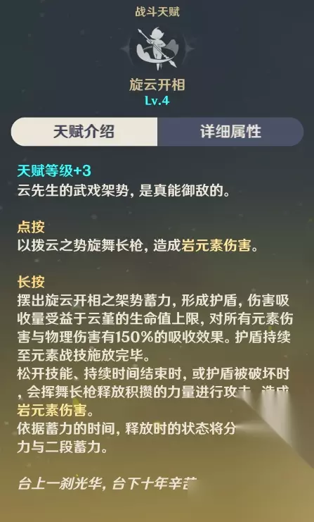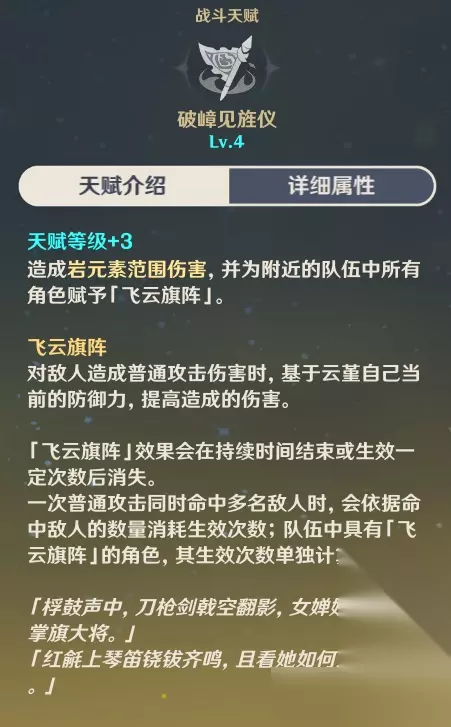 点按:将长枪挥舞一圈,造成岩伤。 长按:基于自身生命值上限形成一个护盾(仅在长按蓄力期间生效),根据蓄力时间分为一段、二段蓄力,二段蓄力结束、松开技能或护盾被打破都会使技能释放,造成岩伤。 经过测试,点按产球2颗,一段蓄力产球2~3颗不等,二段蓄力产球稳定3颗。产球效率一般,因此需要堆叠元素充能效率。 元素战技是范围岩伤,并且伤害倍率是非常可观的,以6级元素战技为例,点按、一段、二段的伤害倍率分别为208.8%、365.3%、521.9%防御力。 云堇的固有天赋4是,当她受到攻击时,能够直接以二段蓄力的形式施放元素战技,并将其用作反弹攻击。也就是说,她可以将对方的攻击直接反弹回去。 在实际战斗中,虽然能够成功地完成弹反是非常好的事情,但战场情况非常复杂,如果不确定能否成功弹反,我建议玩家长按战技并一直保持到释放为止。 造成范围岩伤,并且为队伍中的所有角色赋予【飞云旗阵】。 【飞云旗阵】的作用是增强角色造成普通攻击时的伤害,增强程度根据云堇角色的防御力而定,持续时间为12秒。此效果最多触发30次,同时若攻击命中多个敌人则会耗费多次触发次数,每个队伍成员的飞云旗阵次数均独立计算,互不影响。尽管有30次触发次数,但实际上只有宵宫、绫人和女仆等极少数角色可以达到这个次数。 值得注意的是,这个名为【飞云旗阵】的技能并未锁定角色面板。此外,该技能提供的增伤效果会作用于基础数值乘区,也就是角色属性乘以技能倍率的那个乘区,其中所加入的数值会受到云堇防御力的影响。此外,需要注意的是,这里的普通攻击不包含下落和重击。 举例来说,如果在与宵宫战斗时,使用了携带了【飞云旗阵】的角色,并且在使用E技能进行输出时,此时的基础伤害数值将由宵宫的攻击力乘以普攻倍率再加上E技能的额外倍率,并再加上云堇的防御力乘以【飞云旗阵】的倍率。 有一种类似于北斗、坎蒂丝的战技,可以在点按时直接施放,并有弹反效果。若长按蓄力,可以造成更高的伤害。用户在解锁固有天赋1“务守本真”后,当被攻击时,会施放一个二段蓄力伤害的战技。 这个战技有三个阶段:第一阶段是通过点按触发,会给目标弱化附着一个岩元素,需要1点元素量;第二阶段是需要蓄力,可以给目标强化附着一个岩元素,需要2点元素量;第三阶段需要更长时间的蓄力,可以给目标超强化附着一个岩元素,需要4点元素量。 当使用元素战技命中敌人时,将会产生2颗岩元素微粒。如果进行一段蓄力施放,岩元素微粒数量会增加0-1颗;而进行二段蓄力施放,则会增加1颗岩元素微粒。每次战技最多能产生3颗岩元素微粒。 建议真爱党和弹反玩家可以考虑升级辅助向云堇技能,但也可以选择不升级。 ●元素爆发:破嶂见旌仪