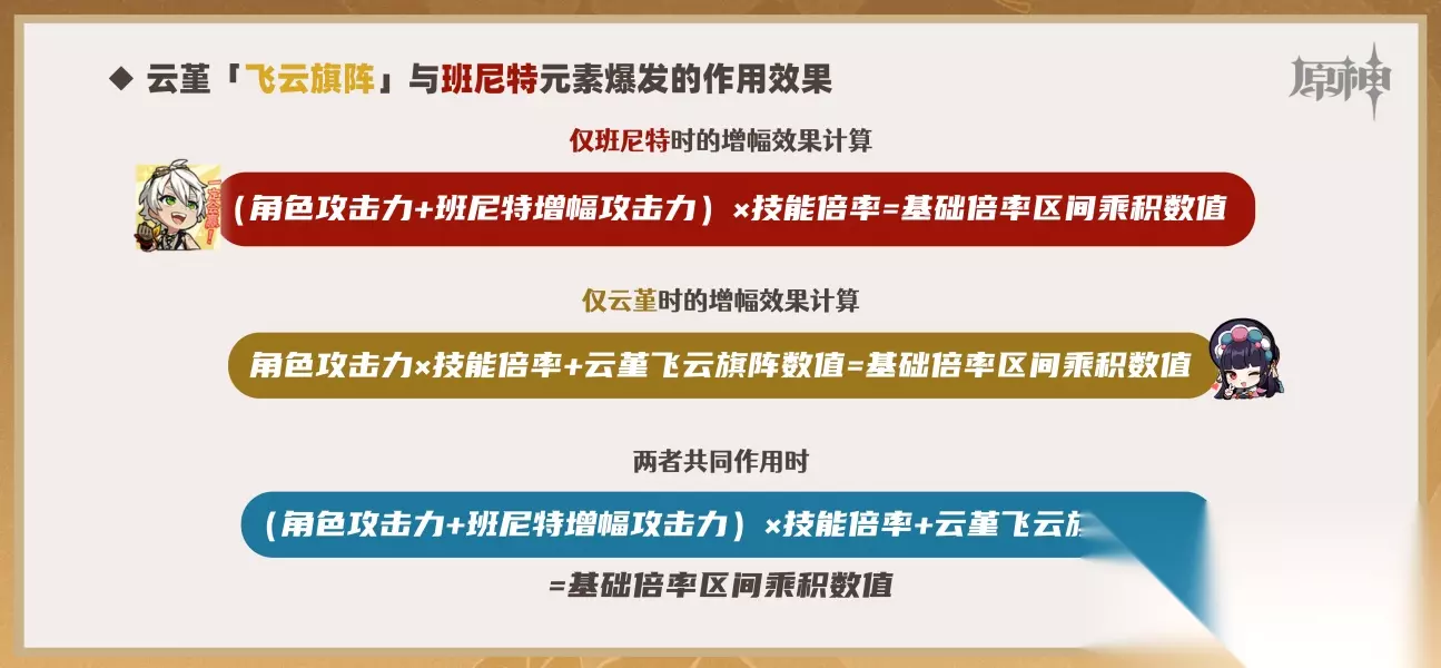 “飞云旗阵”的增幅效果只对角色的基础属性区间和技能倍率区间的乘积(也就是普通攻击的基础倍率)产生影响。普通攻击的基础倍率通常为角色的攻击力与技能倍率的乘积,而使用“飞云旗阵”后,所得到的增益则会加上这个乘积的结果。 与这种伤害区间类似的效果还有:申鹤的战技冰翎、超/蔓激化反应的基础伤害提升、武器「辰砂之纺锤」、圣遗物「来歆余响」的4件套效果,以及一些角色的技能和固有天赋等等。 "飞云旗阵"的提升效果会随着触发角色增伤、暴伤提升而进一步提升(具体的计算可以查看下方内容)。
