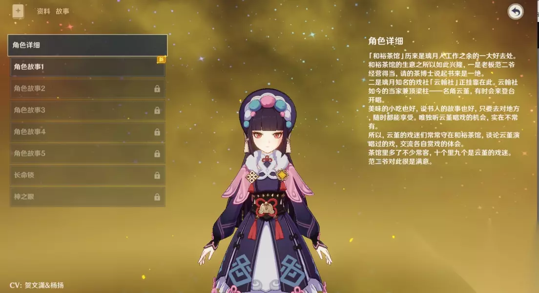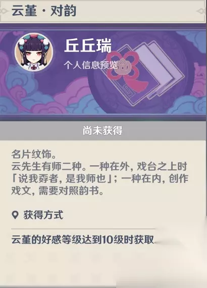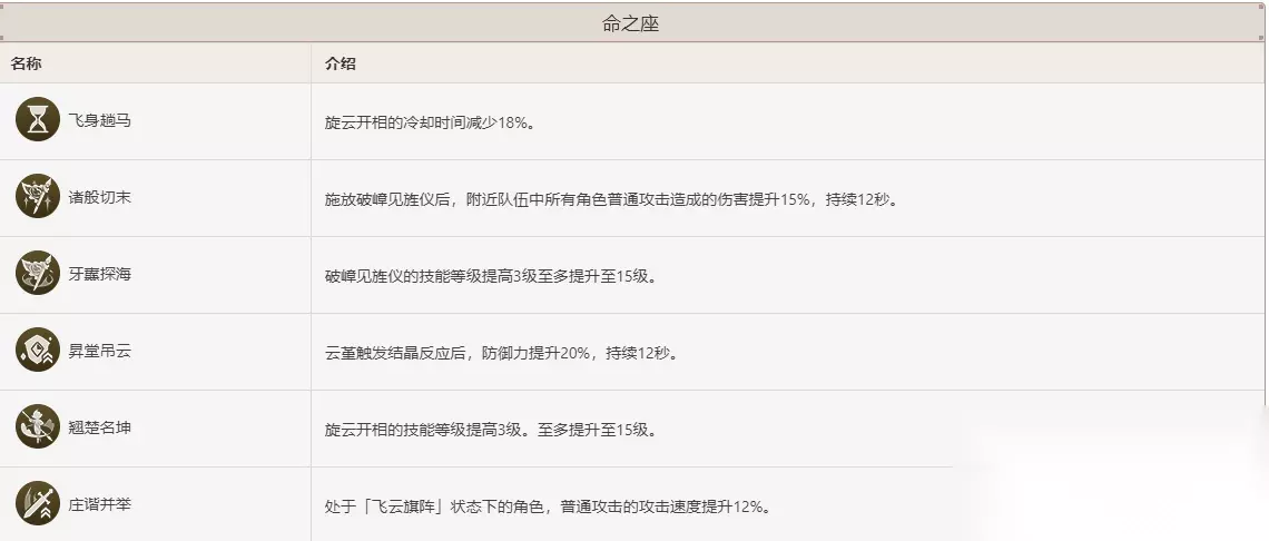 【1命-飞身越马】 描述:旋云开相的冷却时间减少18%。 这个命座解锁后会缩短云堇的元素战技冷却大约1.7秒。虽然云堇的元素战技主要在登场时施放大招,但间隔时间较长,因此这个命座对输出循环的提升并不是很显著。 【2命-诸般切末】 描述:施放破嶂见旌仪后,附近队伍中所有角色普通攻击造成的伤害提升15%,持续12秒 解锁2命之后,该角色在使用元素爆发后会获得提升普攻伤害的能力,这种提升属于增幅区间,与元素伤害加成叠加计算。与元素爆发的增幅机制不同,这种技能只能带来一定程度的增幅,但效果仍可圈可点。 【3命-牙纛探海】 描述:破嶂见旌仪的技能等级提高3级至多提升至15级。 评价:没什么好说的,提升元素战技等级。 【4命-升堂吊云】 描述:云堇触发结晶反应后,防御力提升20%,持续12秒。 评价:解锁了4命之后,云堇可以通过触发结晶反应来额外提高防御力,从而进一步增强「飞云旗阵」所带来的普通攻击增幅。不需要让云堇专门去拾取结晶,只需触发结晶反应即可。当云堇触发结晶反应时,其防御力可额外提升20%。云堇的防御力相当于为驻场角色提供攻击力,但需要触发结晶反应才能生效。因此,在像岩队这样的队伍中,云堇的效果无法发挥,泛用性并不是很强。 【5命-翘楚名坤】 描述:旋云开相的技能等级提高3级。至多提升至15级。 评价:没什么好说的,提升元素爆发等级。 【6命-庄谐并举】 描述:处于「飞云旗阵】状态下的角色,普通攻击的攻击速度提升12%。 评价:.解锁6命后,该命座带来的攻速提升将使角色打出更多普攻,进一步提高「飞云旗阵」的利用率。 三、名片展示