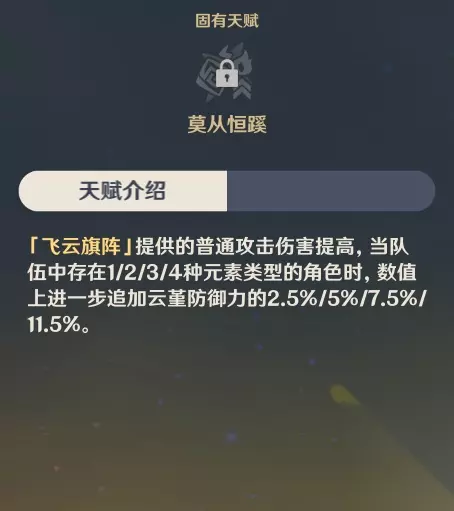 队伍中使用的元素类型越多,「飞云旗阵」将获得更高的额外防御增幅倍率。不必非要使用4种不同的元素类型,可以根据队伍情况进行灵活选择。虽然这个天赋的效果很好,但我们不必为了它而特意去凑齐4种不同元素的角色,毕竟相同元素之间也会存在元素共鸣,也会有一定的增幅效果。 ●固有天赋:清食养性