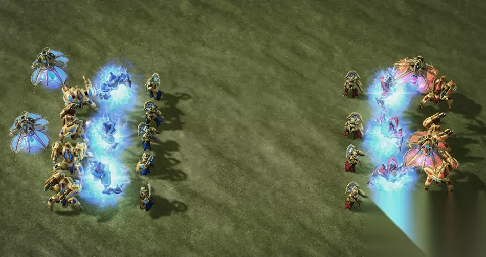 相比起人族神族的内战就经常是两种模式了,一种是和人族差不多的中规中矩打法,打着打着一放有了优势然后一波推死,而另一种内战方法就十分的精彩,由于神族本身的建造建筑的特性和折越的机制,这使得许多神族玩家喜欢在天梯上用各种狗招来阴对方,而这种方法在内战中尤为常见,比如可能这边放的是野隐刀,那边放的就是野先知,所以在这种情况下就是考验神族的纪律性,往往谁的纪律性好,侦查的位置比较精妙那么就会获得一定的优势,如果他在残局的战斗中还有一定的经验,那么神族互狗后的局面就是有经验的一方更容易获胜,所以神族内战时往往就是拼的智商。