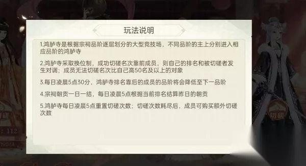 鸿胪寺刷新和结算时间: 每日凌晨5点30分,鸿胪寺排名靠后的成员的品阶将会降低至下一品阶 ; 宗祠朝贡一日一结,每日凌晨5点根据当前排名结算昨日的朝贡; 鸿胪寺每日凌晨5点重置切磋次数;切磋次数耗尽后,成员可购买额外切磋次数。