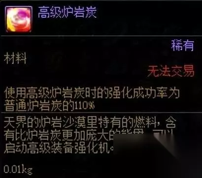 再后来,游戏中还推出高级炉岩碳,比普通炉岩碳的强化成功率更高,一度成为土豪的最爱。随着版本的更迭,炉岩碳最终被删除,无色小晶体已经完全替代了它。有一说一,这个改动还是挺好的。