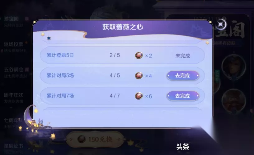 第一个是通过完成任务。从27日开始,累计登录,每天可获得两颗玫瑰心,累计最多五天。参加累积游戏还可获得玫瑰之心。一场游戏可获得2 颗玫瑰心,三场游戏可获得3 颗玫瑰心,五场游戏可获得4 颗玫瑰心,最多可获得7 颗。本场游戏可获得6 颗玫瑰心。所以通过做任务,我们最多可以获得25颗玫瑰心。