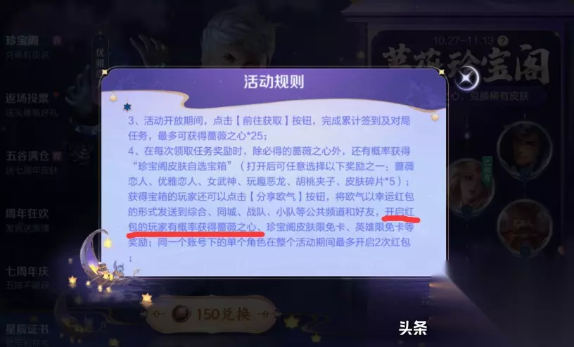 二是任务中每次领取玫瑰之心,都有机会获得“珍宝阁皮肤可选宝箱”。拥有活跃宝箱的玩家点击分享欧洲能量后,将获得红包形式的欧洲能量。发送出去,打开红包的玩家就有可能获得玫瑰之心。活动期间每位玩家最多只能打开红包两次。红包中,只有5%的几率获得两颗玫瑰心,剩下的都是皮肤经验卡,所以在红包中,我们最多可以获得4颗玫瑰心。