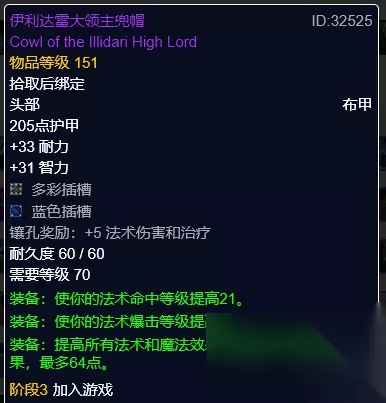 伊利达雷大领主兜帽 伊利达雷大领主兜帽,伊利丹掉落。精神、命中、暴击,暴击属性高、带命中属性对暗牧性价比不是很高。