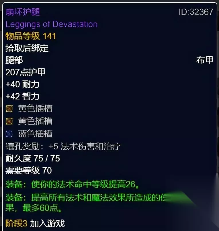 崩坏护腿,莎赫拉丝主母掉落。两黄一蓝三插孔,奖励5法伤,高命中属性。