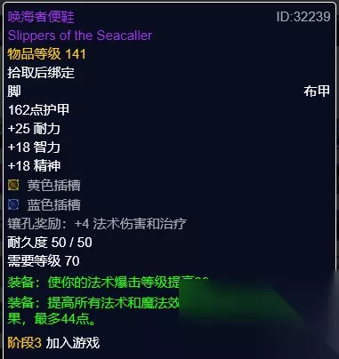 唤海者便鞋 唤海者便鞋,高阶督军纳因图斯掉落。智力、精神属性,蓝黄双孔,奖励4点法伤。