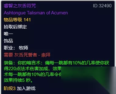 睿智之灰舌符咒 睿智之灰舌符咒,黑暗神殿声望奖励。触发加法术强度。 饰品建议选择银色新月徽记搭配睿智之灰舌符咒或是玛瑟里顿之眼,古尔丹之颅主动使用提升急速,但是对于暗牧来说性价比不是很高。 魔杖