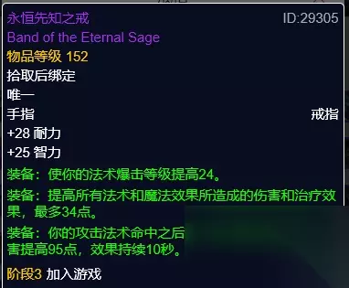 永恒先知之戒 永恒先知之戒,海加尔峰声望奖励。高智力,触发加法术伤害。