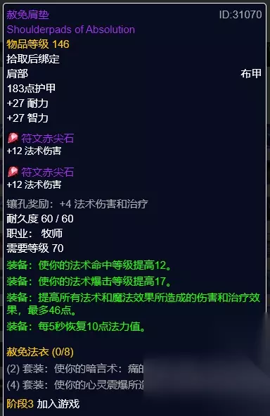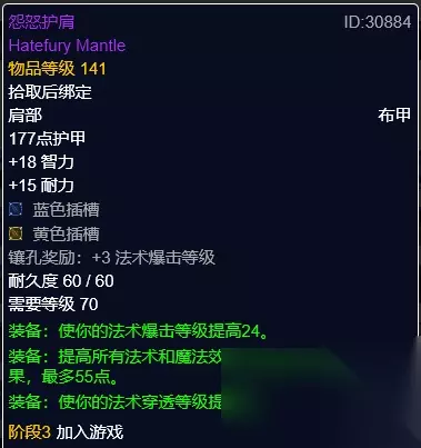 怨怒护肩 怨怒护肩,安纳塞隆掉落。蓝黄双孔,奖励3法爆,法穿装备。 肩部建议是首选敏锐思维衬肩,急速对暗牧的提升还是比较大的,而且T6套装肩部的属性也比较的一般,所以T6套装肩部作为备选。怨怒护肩是一个比较特殊的装备,可以选择在特定的boss战的时候换上使用,法穿属性在特定的时候还是比较好的。 披风