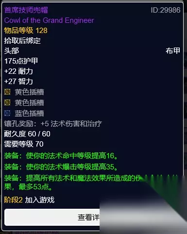 首席技师兜帽 首席技师兜帽,风暴要塞空灵机甲掉落。两黄一篮三插孔,插孔多属性和伊利达雷大领主兜帽类似。 头部推荐首选T6套装头部,属性契合暗牧且套装效果对暗牧的提升也不错。伊利达雷大领主兜帽和首席技师兜帽则作为备选或是过渡装备使用。 颈部