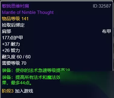 敏锐思维衬肩 敏锐思维衬肩,裁缝制造拾取绑定。急速装备。
