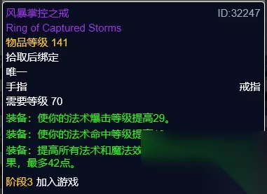 风暴掌控之戒 风暴掌控之戒,高阶督军纳因图斯掉落。高暴击,命中戒指。 戒指选择搭配极致急速配装就选择双远古知识之戒,其次可以选择一个远古知识之戒搭配一个永恒先知之戒,风暴掌控之戒则是命中不够的时候替换掉其中一个。 饰品