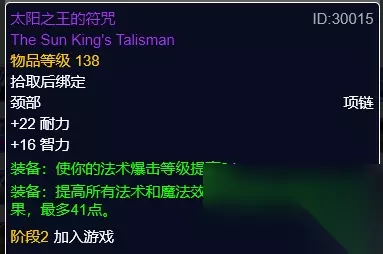 太阳之王的符咒 太阳之王的符咒,风暴要塞王子魔珠任务获取。智力属性,暴击和法术伤害加成。