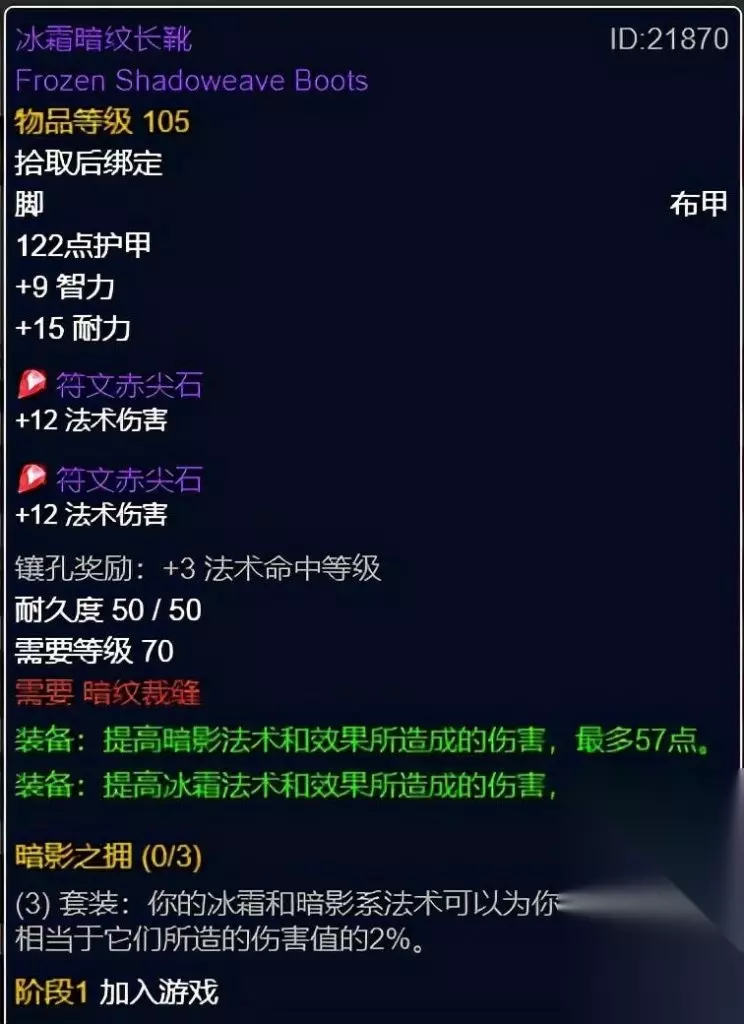 冰霜暗纹长靴 冰霜暗纹长靴,暗纹裁缝制造。暗影伤害装备,黄蓝双孔。