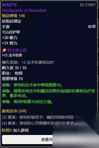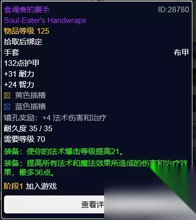 食魂者的裹手 食魂者的裹手,玛瑟里顿掉落。黄蓝双孔,奖励4点法伤。 手套首选T6手套凑4T6效果,若是已经达到4T6可以考虑食魂者的裹手。 腰带