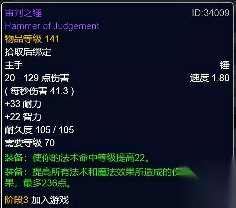 审判之锤 审判之锤,海加尔峰小怪掉落。命中、法强武器。