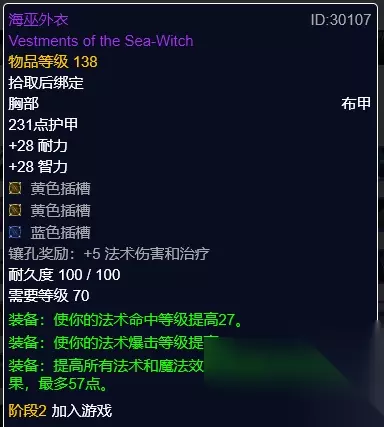 海巫外衣 海巫外衣,毒蛇神殿瓦丝琪掉落。两黄一蓝三插孔,奖励5点法伤。